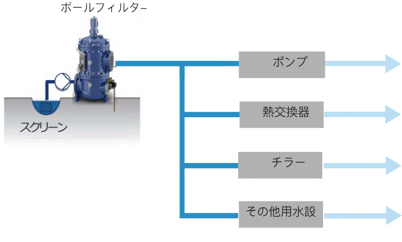 海水から取水した用水をろ過することで、熱交換器、クーラー、チラー、ヒートポンプなどを保護。使った水を再利用または排水するための粗ろ過にもオートストレーナを採用し、機器への汚れの侵入を防ぐとともに、環境にも配慮しています。