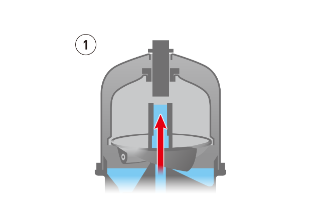 ①下部のノズルからライン圧力を利用してコシ器内に流体を流入させ、下部のノズルから噴射します。