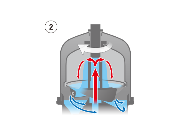 ②噴射の反動によって内部ロータが回転し、強い遠心力が発生します。